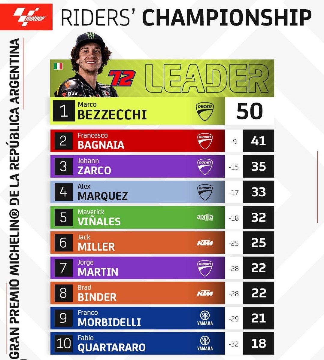 MotoGP Argentina 2023 berlangsung dalam kondisi basah, di Termas de Rio Hondo, Senin (3/4/2023) dini hari WIB. Pebalap Mooney VR46 Marco Bezzecchi tampil dominan, memimpin balapan sedari tikungan pertama hingga garis finis.