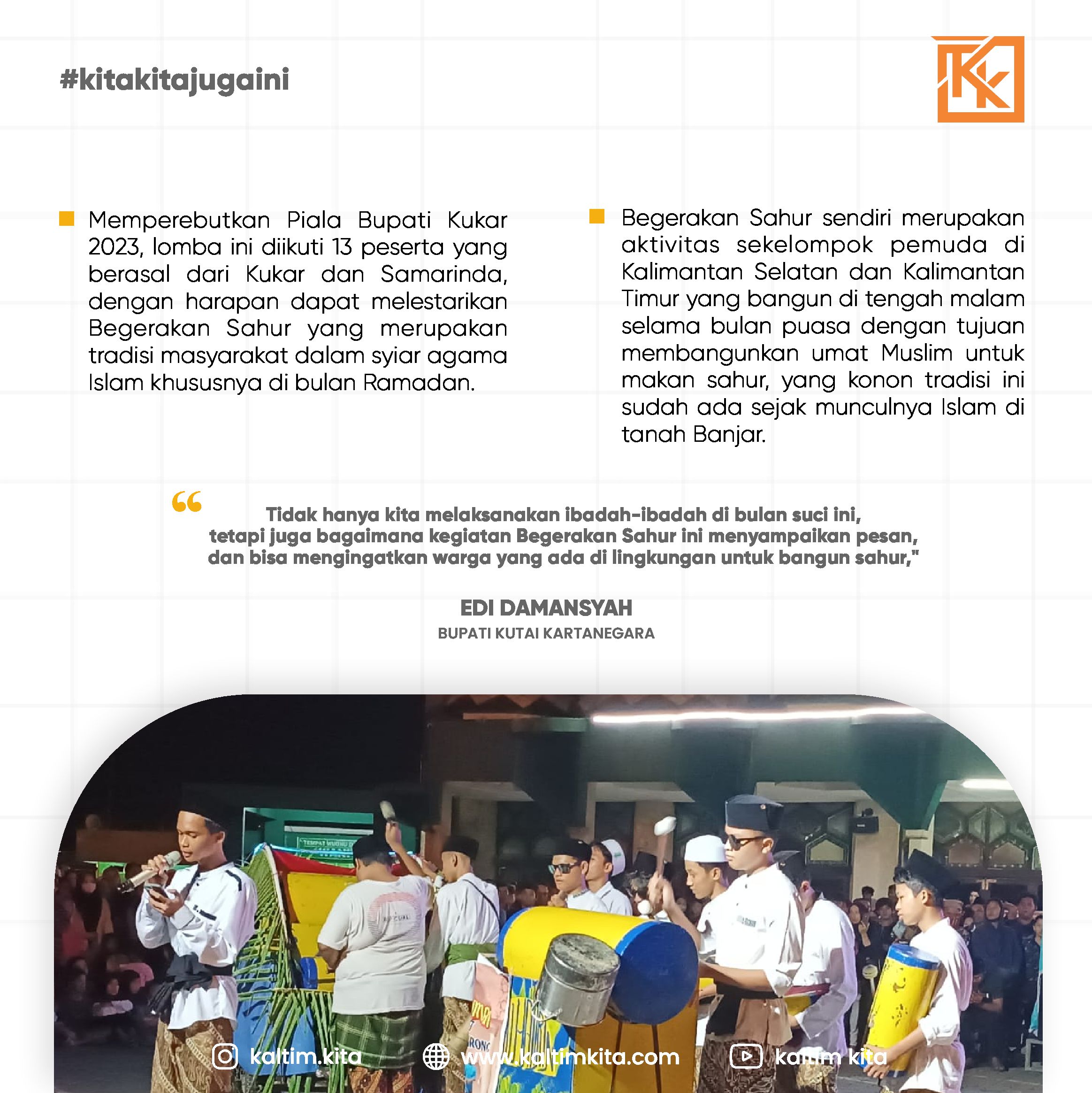 Lomba yang memperebutkan piala Bupati Kukar tahun 2023 ini berlangsung meriah, hal ini bisa dilihat dari banyaknya pengunjung yang hadir untuk menyaksikan lomba Begerakan Sahur yang diikuti 13 peserta baik dari Kukar maupun Samarinda.