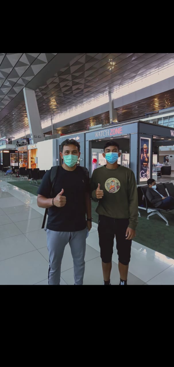 Adika Ardhiswara saat berfoto bersama Coach Bima Sakti saat ingin bertolak kembali ke Balikpapan.