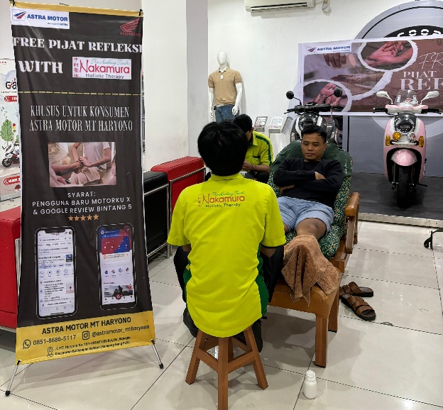 “Selain memberikan kenyamanan dalam perawatan sepeda motor Honda, kami juga ingin menghadirkan pengalaman berbeda melalui pijatan relaksasi dari Nakamura agar konsumen semakin merasa nyaman dan rileks saat menunggu motornya diservis,” ujar Teguh Dwi Prabowo Branch Head Astra Motor MT Haryono.