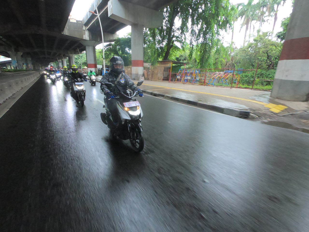 (Ukuran sesuai dan berwarna cerah)* -Jas hujan model setelan (atasan dan bawahan) -Helm dengan visor bening -Gunakan sepatu anti air / karet -Gunakan sarung tangan
