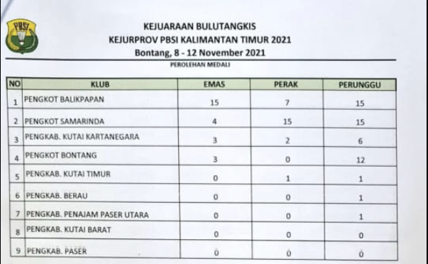 Sementara Samarinda harus puas finis di posisi dua, setelah hanya mengumpulkan 4 emas, 15 perak dan 15 perunggu. Posisi tiga ditempati Kabupateng Kukar dengan koleksi 3 emas, 2 perak dan 6 perunggu.