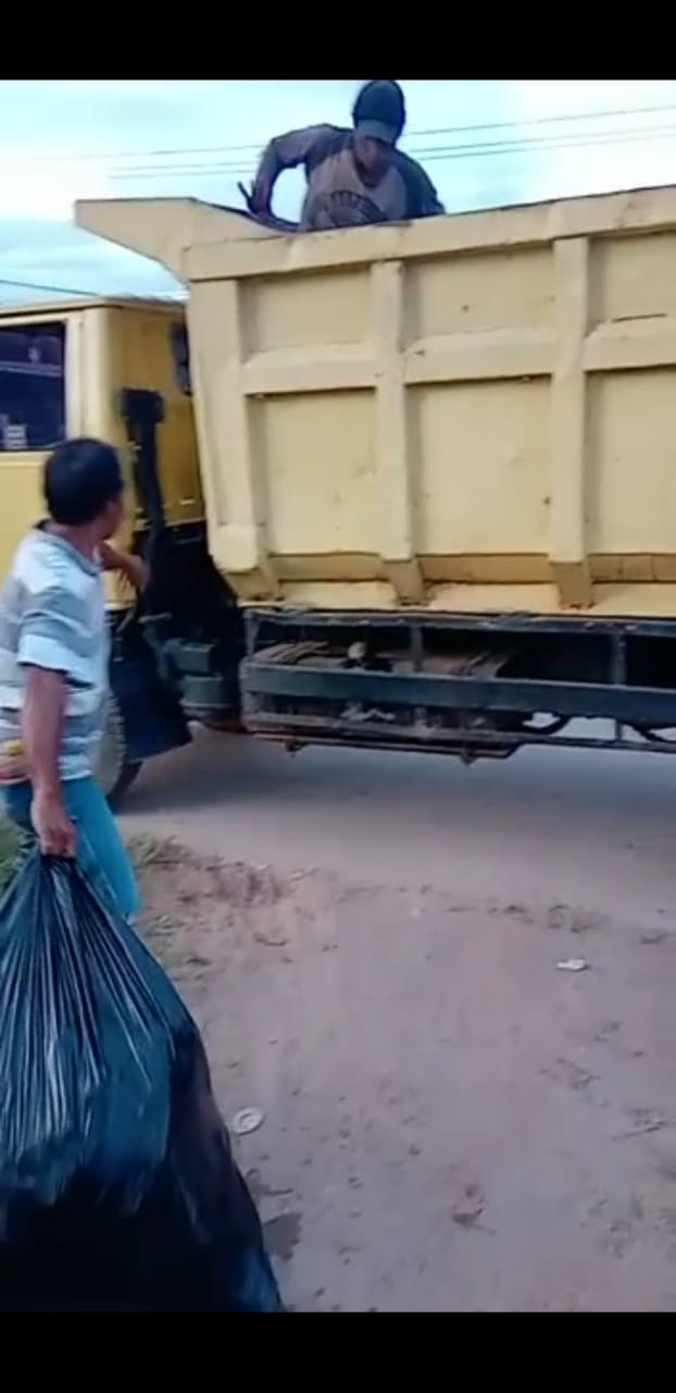 Bahu membahu bongkar muat sampah di bak sampah dump truk yang disewa pribadi ketua RT 13 Heru