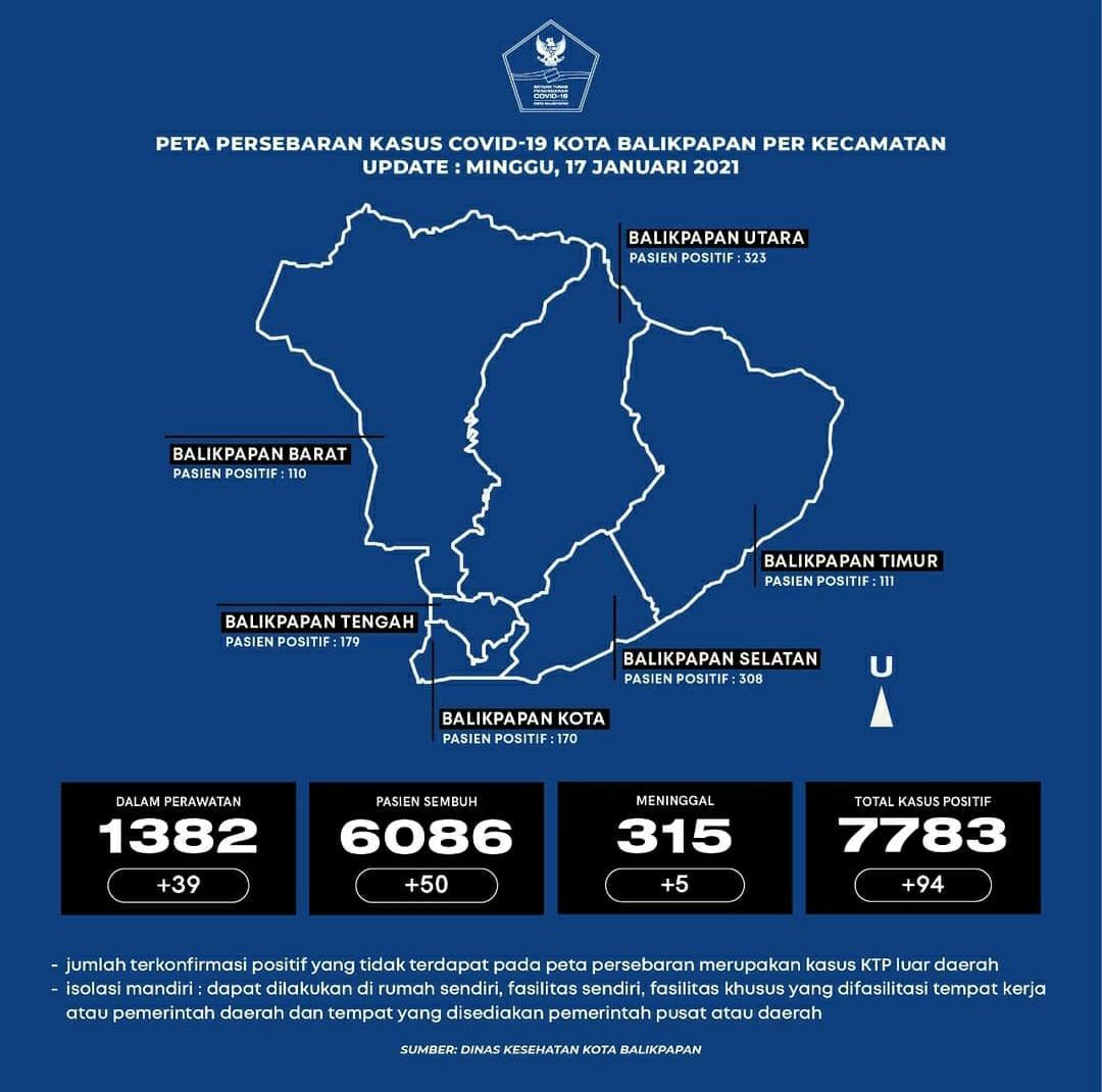 Jika sehari sebelumnya mencapai angka 147, sesuai laporan Satgas Penanganan Covid-19 Kota Balikpapan pada hari ini, Minggu (17/01/2021) terdapat penambahan kasus terkonfirmasi positif sebanyak 94 kasus dengan 5 kasus meninggal dunia.