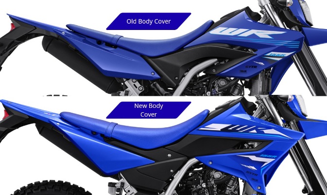Desain body baru itu tersaji pada bagian body cover depan hingga ke belakang. Bagian body cover Yamaha WR155 R 2026 kini meng-highlight penampilan body yang lebih rapat & padat. Bagian hitam di bawah jok motor, semakin memberikan kesan & citra off-road yang lebih menonjol dari sebelumnya. Garis horizontal yang tegas, mulai dari penutup samping hingga penutup radiator dan fender depan menciptakan tampilan yang kuat dan modern, seolah-olah sedang melaju ke depan.