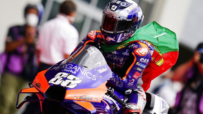 "Sangat bahagia. Kaki saya masih berpijak ke tanah, tapi kepala saya melayang ke mana-mana merasakan kebahagian yang bukan cuma saya rasakan tapi juga keluarga, semua fan di Portugis, dan semua orang," kata Miguel Oliveira menambahkan. (tim)