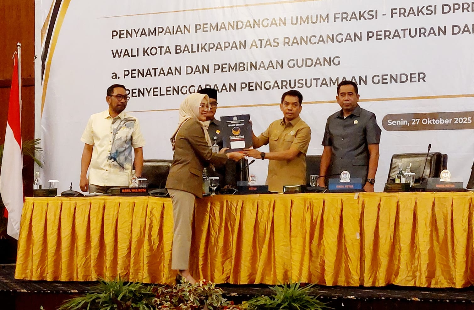 Kaltimkita.com, BALIKPAPAN - Pemandangan Fraksi Partai NasDem DPRD Kota Balikpapan menilai kebutuhan akan regulasi penataan gudang di kota minyak sudah mendesak. Ya, hal ini disampaikan oleh Anggota Fraksi NasDem, Vera Yulianti, dalam Rapat Paripurna ke-3 Masa Sidang I Tahun Sidang 2025/2026 yang digelar di Ballroom Hotel Gran Senyiur, Senin (27/10/2025).