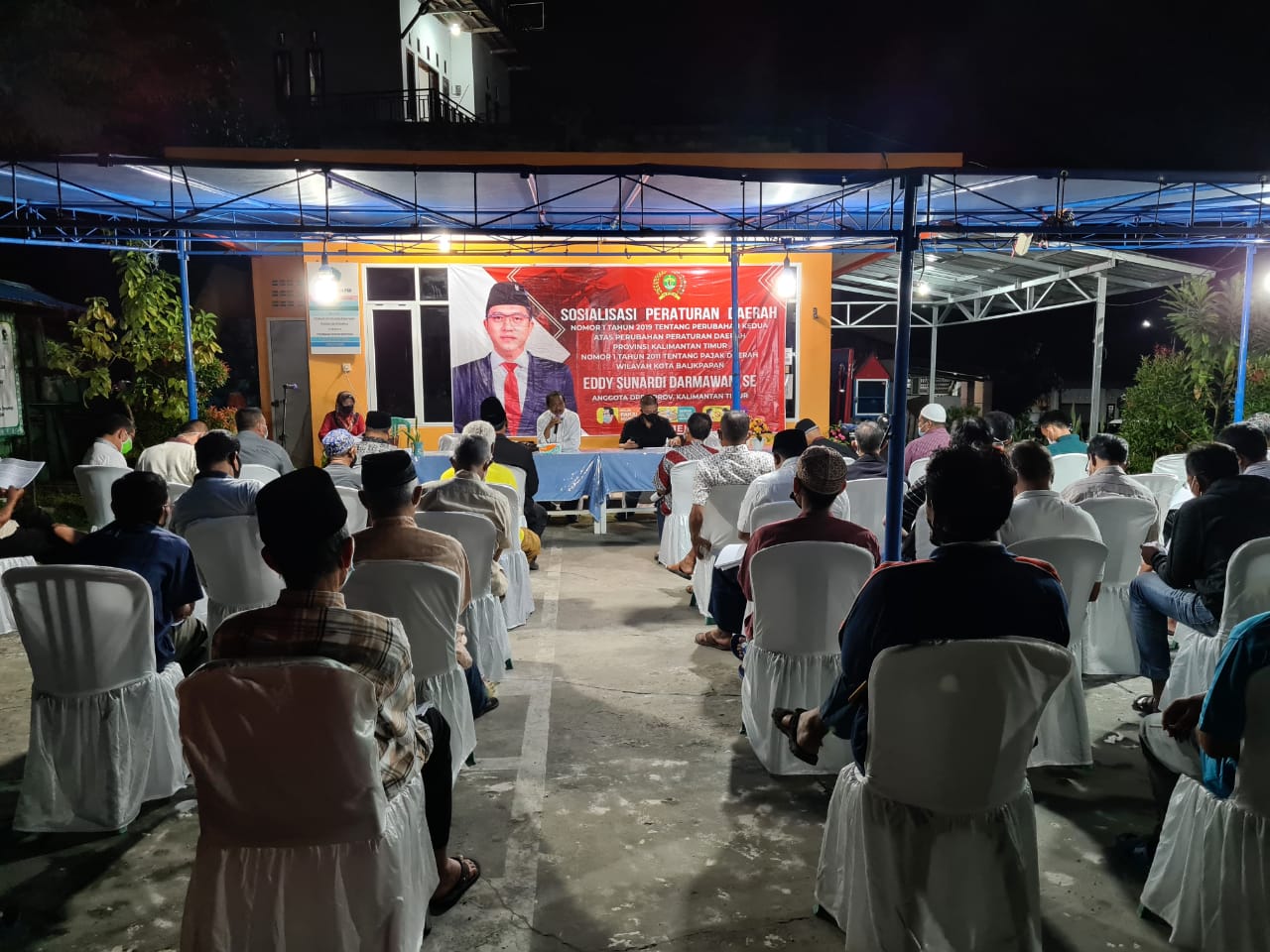 Kaltimkita.com, BALIKPAPAN - Anggota DPRD Kaltim, Eddy Sunardi Darmawan kembali melakukan Sosialisasi Perda (Sosper) pada Minggu (23/5/2021) malam di Lapangan Serbaguna RT 14, Keluarahan Prapatan, Kecamatan Balikpapan Kota.