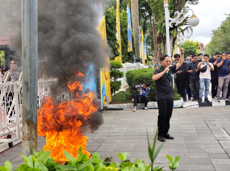 Mereka berkumpul di area halaman depan kantor pemerintahan, dengan satu ban bekas dibakar di atas paving block sebagai simbol protes.
