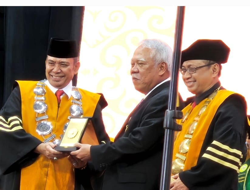 Ketua OIKN Basuki Hadimuljono mendapat plakat dan pin dari Pimpinan Uniba Dr Rendy dan Dr Isradi.