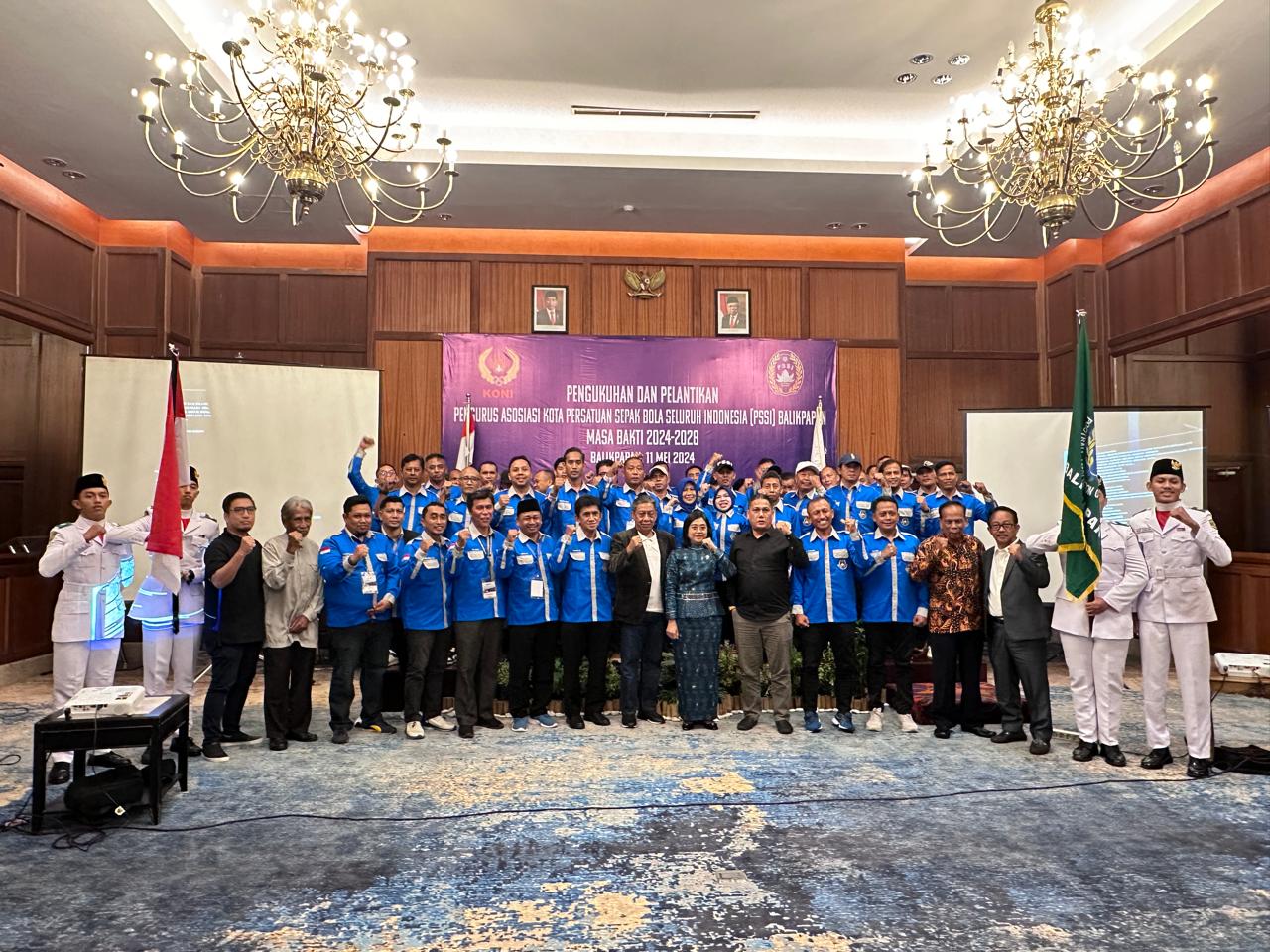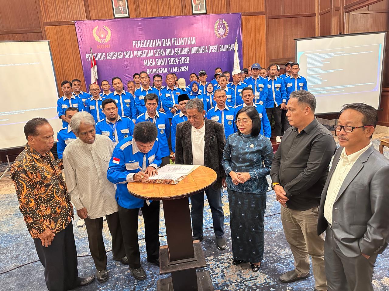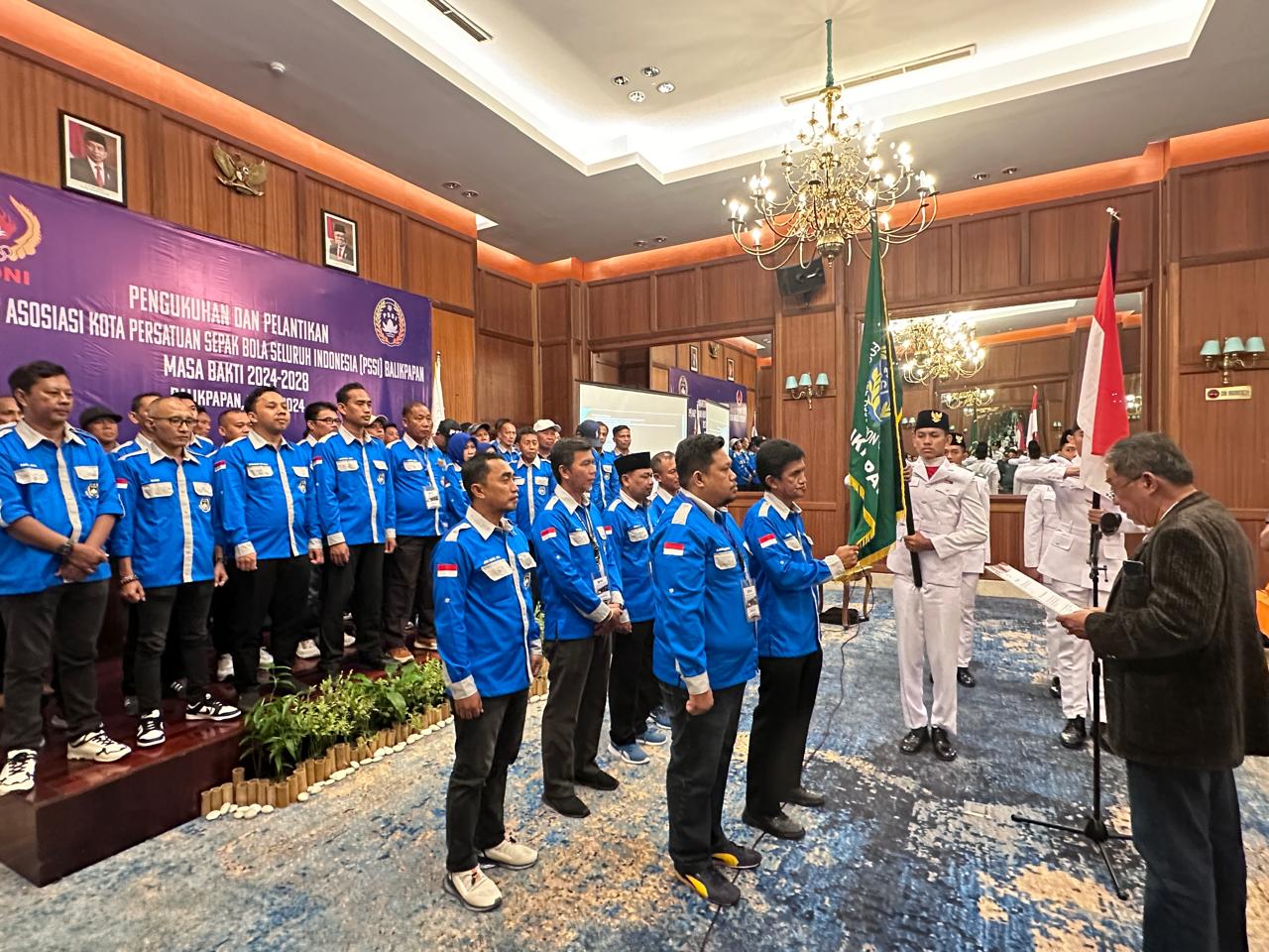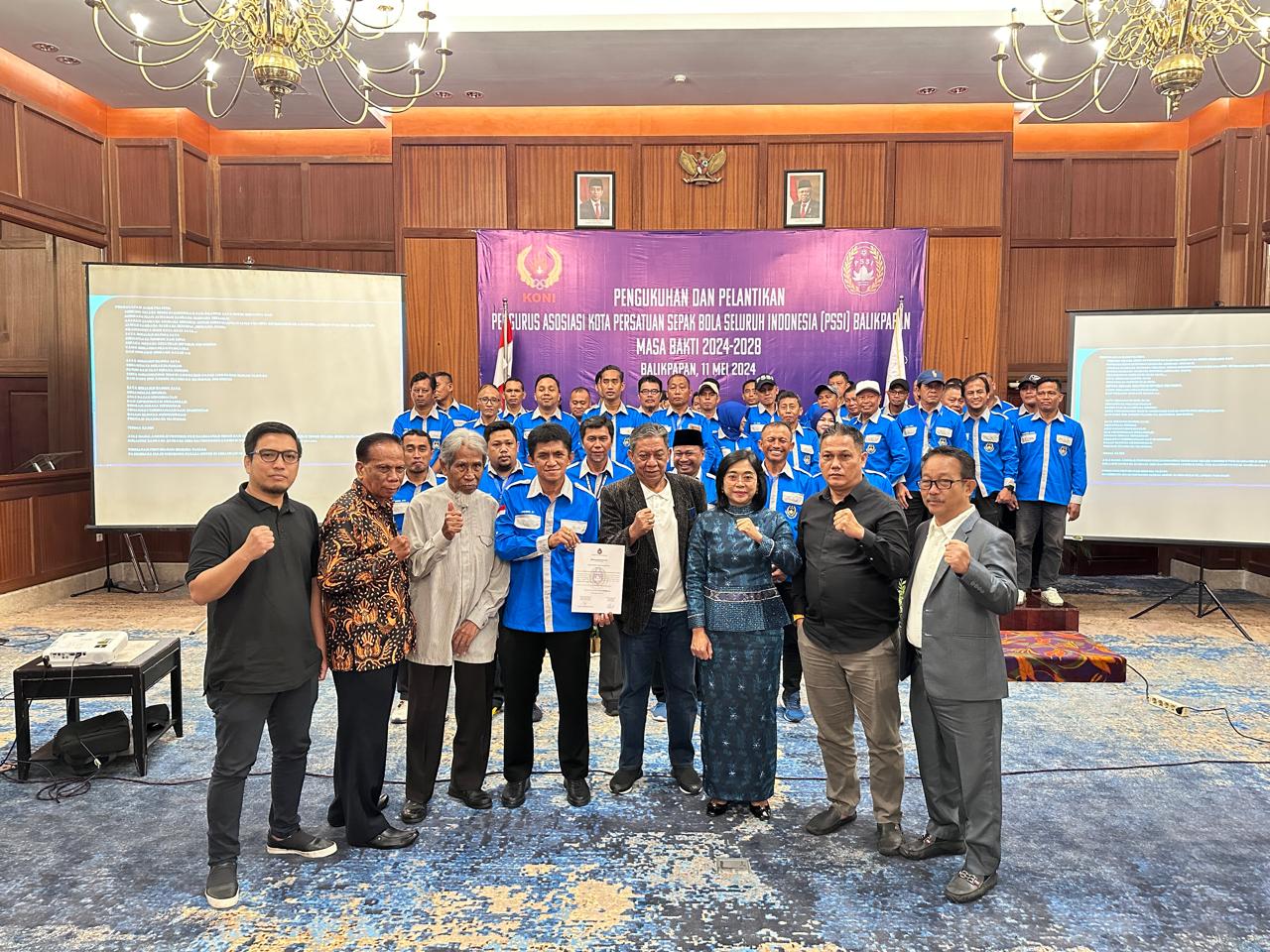 KaltimKita.com, BALIKPAPAN - Kepengurusan Asosiasi Kota (Askot) PSSI Balikpapan resmi dilantik. Di bawah kepemimpinan Sukisno periode 2024-2028, pelantikan berlangsung di Hotel Gran Senyiur, Sabtu (11/5/2024) oleh Wakil Ketua Umum Asprov PSSI Kaltim Syafruddin.