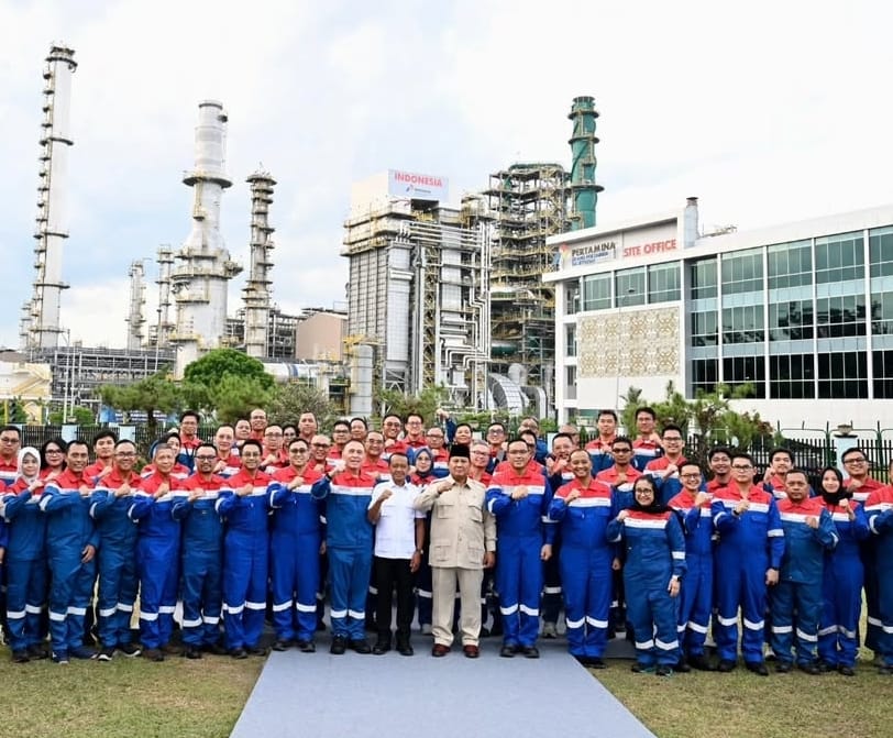 PRESIDEN Prabowo Subianto meresmikan proyek perluasan kilang minyak (RDMP) Pertamina Balikpapan, Senin (12/1). Peresmian ditandai dengan penandatangan prasasti dan penekanan tombol sirine.