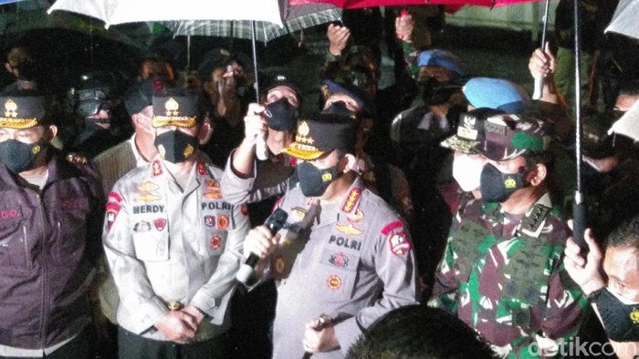 Pukul 20.55 WITA, Minggu (28/3/2021), rombongan Panglima TNI dan Kapolri tiba di lokasi bom bunuh diri. Lokasi yang pertama ditinjau adalah tempat terduga pelaku meledakkan diri. Setelahnya mereka masuk ke dalam Gereja Katedral. (det/and)