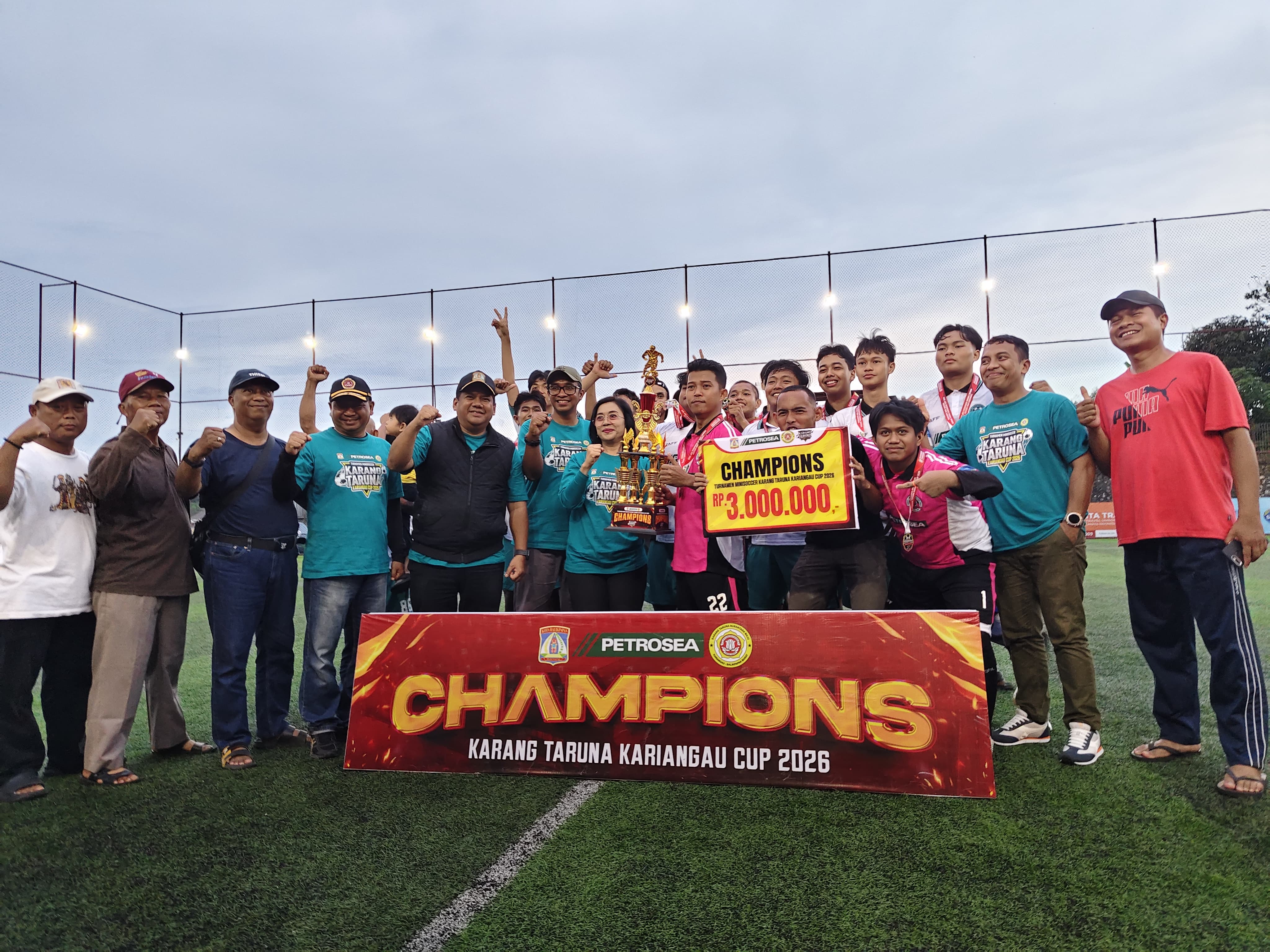 Kaltimkita.com, BALIKPAPAN – Turnamen minisoccer Karang Taruna Kariangau Cup 2026 resmi berakhir dengan menghadirkan pertandingan sengit dan penuh sportivitas. Partai semifinal hingga final yang digelar di Lapangan Minisoccer Borneo Anfield Stadium Balikpapan, Minggu (12/4/2026), menjadi puncak antusiasme warga yang sejak awal memadati area pertandingan.