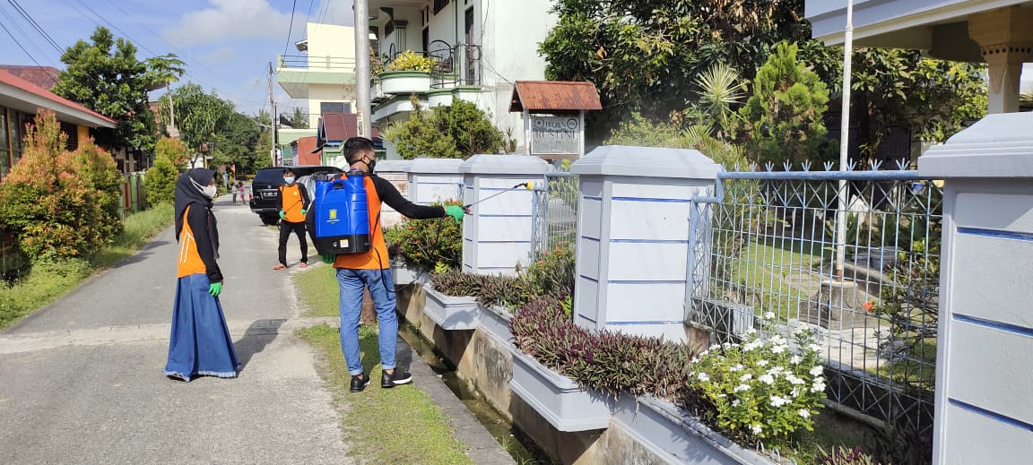 STERILISASI: Mahasiswa KKN Uniba saat membantu penyemprotan disinfektan di RT 23.