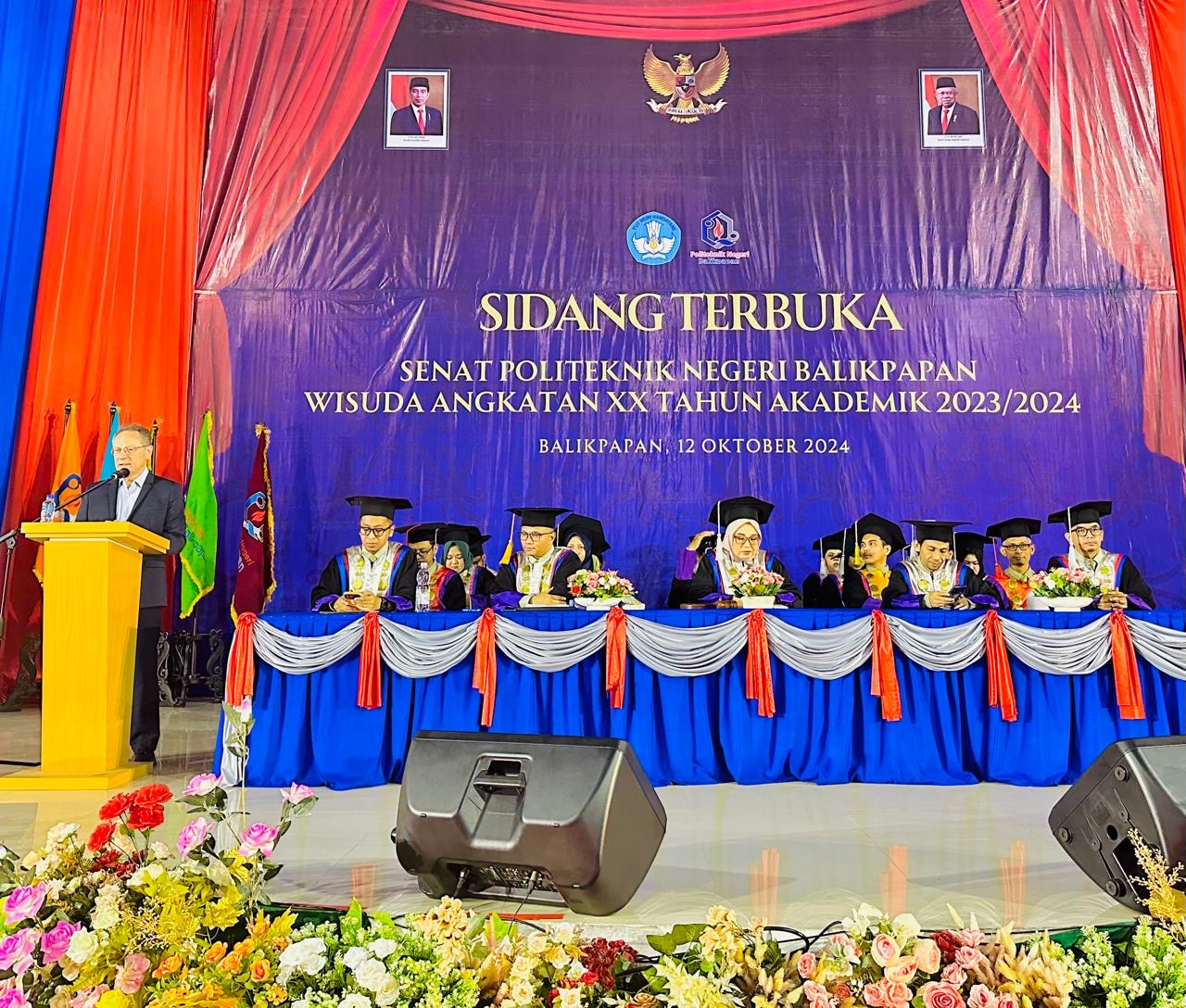 KaltimKita.com, BALIKPAPAN - Politeknik Negeri Balikpapan melaksanakan sidang senat wisuda angkatan XX tahun 2023/2024. Total 377 mahasiswa diluluskan yang berlangsung di Gedung Workshop Terpadu (GWT), Sabtu (12/10/2024) pagi. Dihadiri langsung oleh Pjs Wali Kota Balikpapan Ahmad Muzakkir.