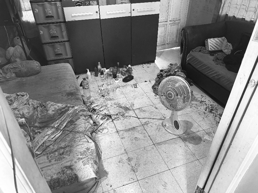 Ceceran darah itu juga merembes ke atas kasur lantai dan sprei yang berantakan di sudut ruangan. Beberapa botol minuman serta barang-barang pribadi lainnya tampak berserakan.