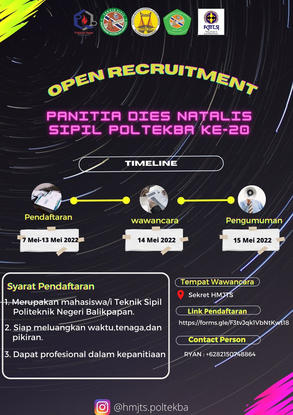 Sementara, demi memperlancar rangkaian kegiatan, HMJ Teknik Sipili tengah membuka pendaftaran kepanitiaan 7-13 Mei 2022. Ditujukan kepada para mahasiswa dan mahasiswi aktif teknik sipil.