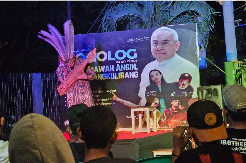 Judulnya menarik. Kalimat yang lazim kita dengar adalah “di bawah rintik hujan.” Tapi judul monolog Isran adalah Rintik Di bawah Angin, Petuah Sangkulirang. Bukan Sangkuriang. Sangkulirang adalah kota kecamatan di Kutai Timur (Kutim), tempat kelahiran Isran Noor, 67 tahun silam.