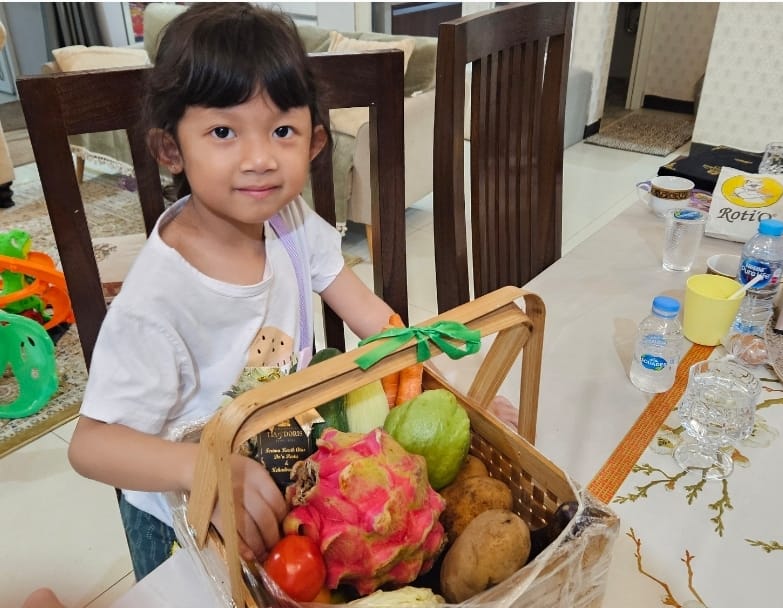 Cucu saya, Jenna penuh semangat membuka keranjang sayur dan buah hadiah dari pengantin.