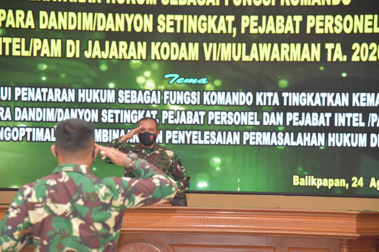 KaltimKita.com, BALIKPAPAN-Pangdam VI/Mulawarman Mayjen TNI Heri Wiranto, S.E., M.M., M.Tr (Han), hari ini resmi membuka program Mobile Training Team (MTT) Penataran Hukum sebagai fungsi komando bagi para Dandim/Danyon setingkat, Pejabat personel dan Intel/PAM di jajaran Kodam VI/Mulawarman TA. 2020 yang di gelar di Aula Makodam VI/Mulawarman, Senin (24/08/202).