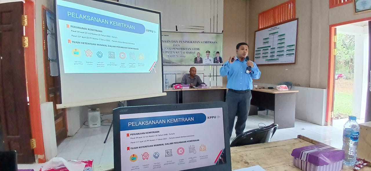 Kaltimkita.com, KUBAR- Kepala Bidang Kajian dan Advokasi Kanwil V KPPU Samarinda Ratmawan Ari Kusnandar menjadi salah satu pembicara dalam kegiatan bertajuk “Pembinaan dan Peningkatan Kemitraan Perkebunan Sawit di Kabupaten Kutai Barat” yang diselenggarakan oleh Dinas Perkebunan Provinsi Kalimantan Timur. Dalam pertemuan ini Ari menyampaikan terkait peran KPPU dalam pengawasan perjanjian Kemitraan baik secara umum ataupun dalam intiplasma Perkebunan sawit.