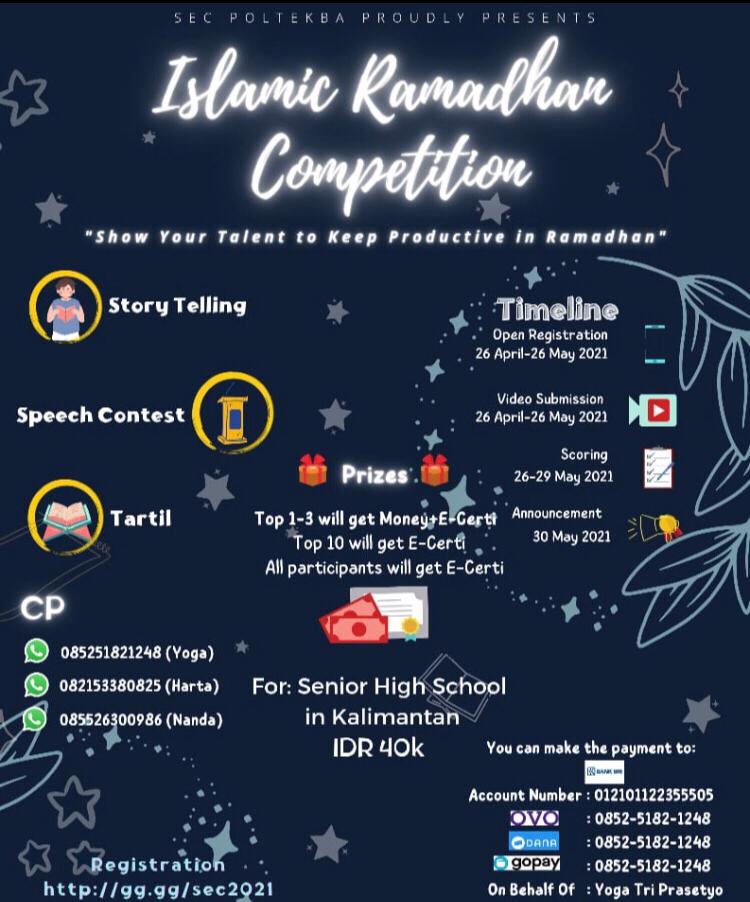 UKM Students of English Community (SEC) Poltekba ini menggelar lomba untuk tingkat SMA se-Kalimantan. Tiga kategori lomba akan tersaji yakni Story Telling, Speech Competition serta Tartil dalam bahasa Inggris.