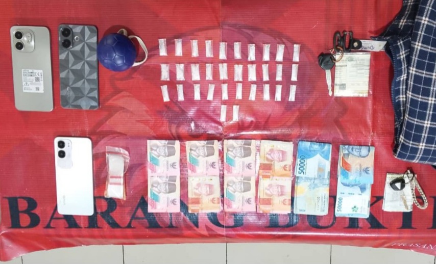 Dalam operasi tersebut, polisi berhasil menyita sejumlah barang bukti, di antaranya 32 paket plastik klip berisi sabu dengan berat bruto 11,14 gram, beberapa unit handphone, uang tunai sebesar Rp6.000.000, dua unit sepeda motor, jaket, bola plastik, serta plastik klip kosong yang diduga digunakan untuk aktivitas pengemasan narkoba.