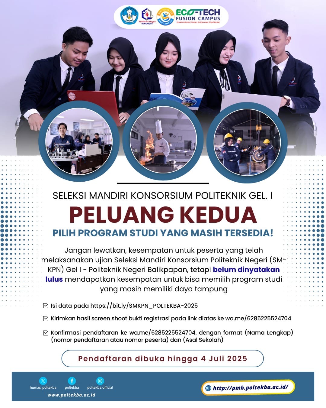 Kesempatan ini diberikan untuk memilih program studi yang masih memiliki daya tampung. Langkah ini merupakan bentuk komitmen Poltekba dalam memberikan ruang pendidikan yang inklusif dan merata bagi seluruh calon mahasiswa.