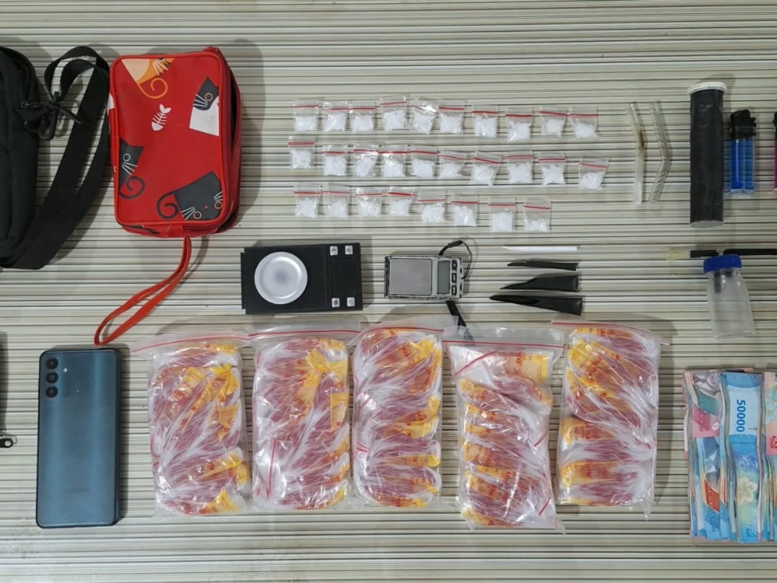 Pengembangan lebih lanjut membawa petugas pada tersangka kedua berinisial E (47), yang diamankan pada malam yang sama sekitar pukul 22.30 Wita di sebuah pondok tidak jauh dari rumah tersangka A. Dari hasil penggeledahan, petugas menemukan 50 bungkus plastik bening berisi sabu dengan berat kotor 9,77 gram yang disimpan di dalam dompet milik tersangka E.