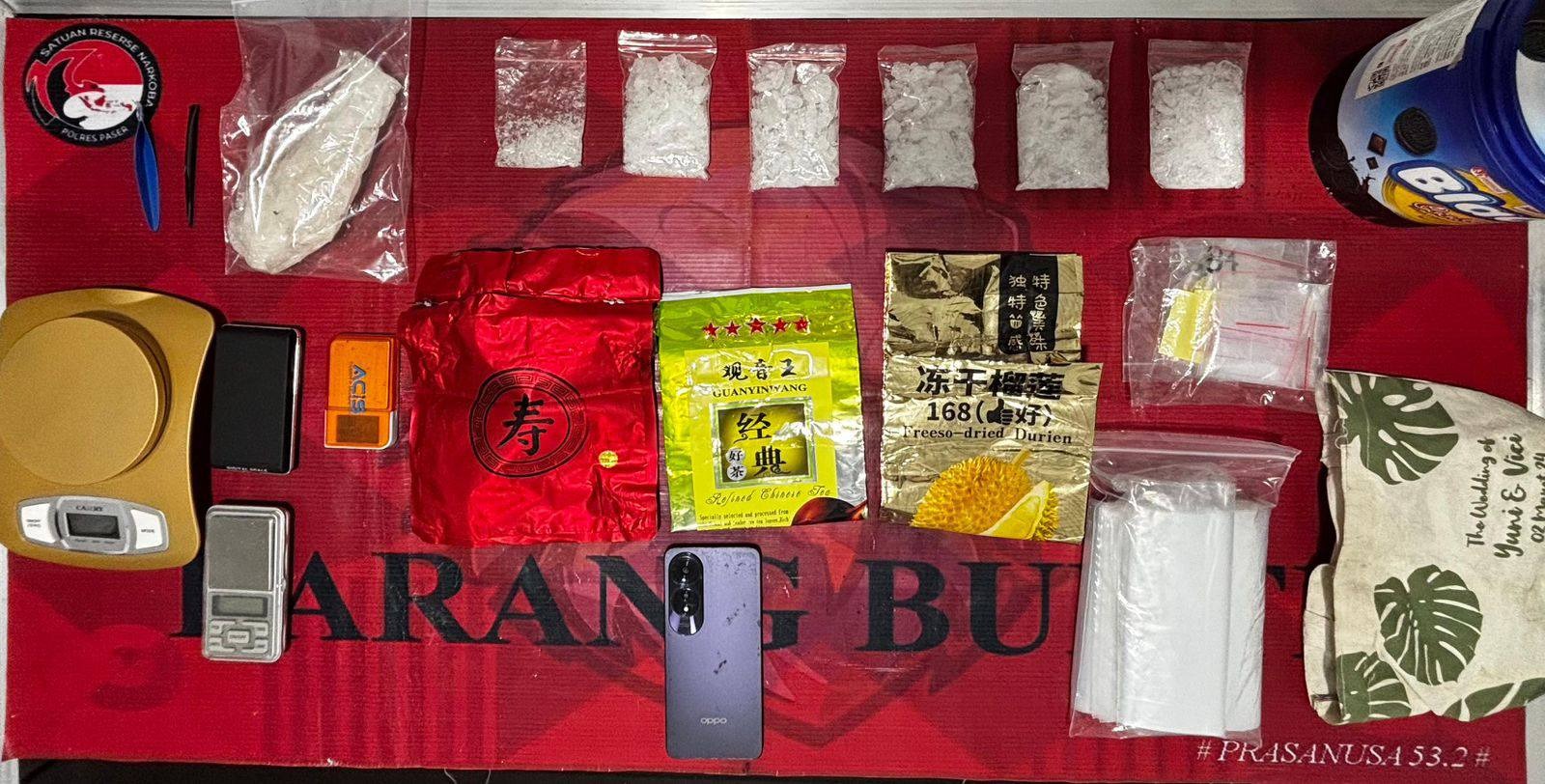 Penangkapan dilakukan pada Rabu, 4 Februari 2026, sekitar pukul 02.30 WITA, di sebuah rumah kontrakan di Kecamatan Tanah Grogot, Kabupaten Paser, Kalimantan Timur. Dalam penggeledahan, petugas menemukan 7 paket narkotika jenis sabu dengan berat bruto 386 gram, serta sejumlah peralatan yang diduga digunakan dalam transaksi narkoba, seperti timbangan digital, plastik klip kosong, sendok takar, dan barang bukti lainnya.