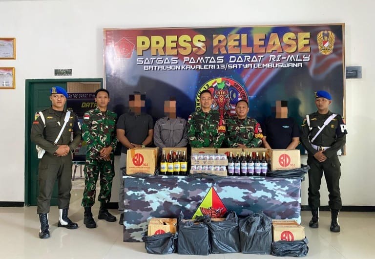 Kaltimkita.com, Nunukan – Komitmen menjaga keamanan wilayah perbatasan kembali ditunjukkan Satgas Pamtas RI–Malaysia Yonkav 13/SL. Melalui patroli gabungan bersama Unit Intel Kodim 0911/Nunukan, aparat berhasil menggagalkan upaya penyelundupan minuman keras (miras) ilegal di wilayah perbatasan RI–Malaysia.