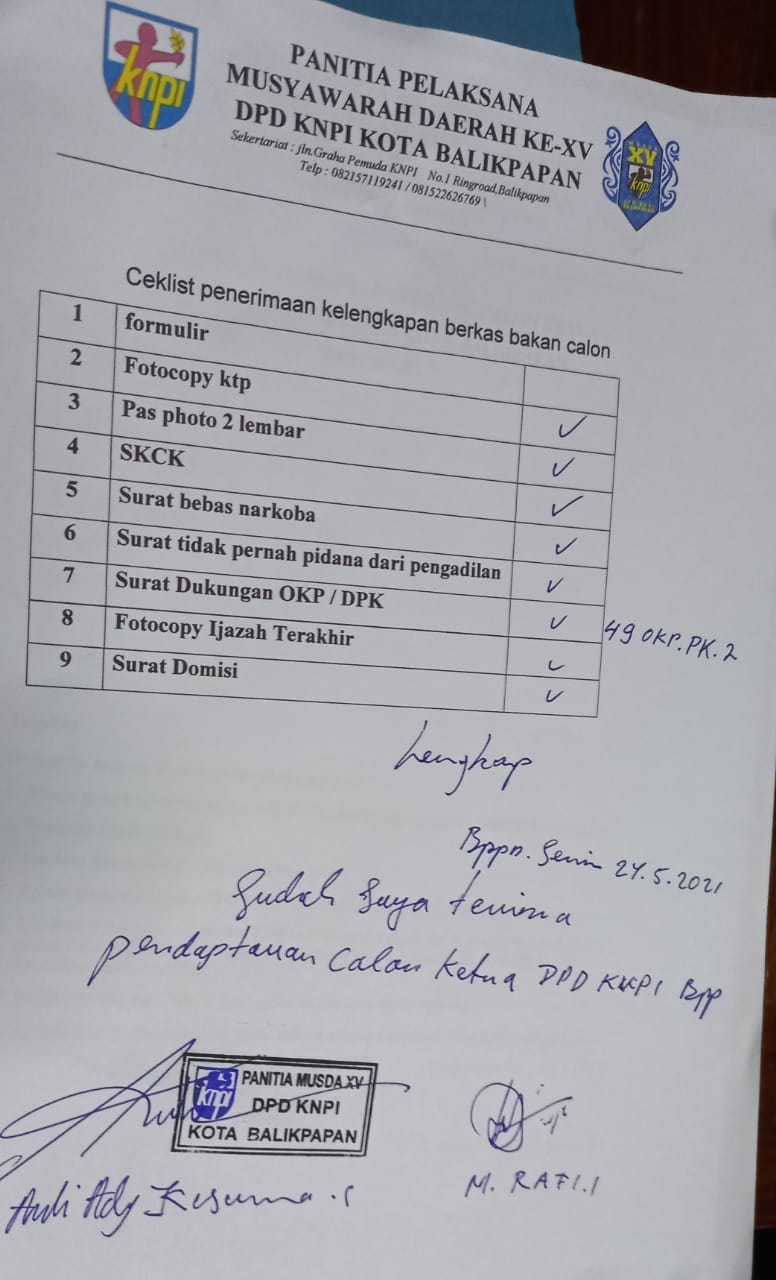 “Ya, pada hari ini pertama ada satu yang mengambil formulir pendaftaran. Kedua ada salah satu calon bernama Andrie Afrizal mengembalikan berkas pendaftaran. Untuk kelengkapan berkas sudah komplit dan sudah kami terima semua, sesuai peraturan yang ada, artinya seluruh persyaratan pendaftaran sudah dilengkapi semua oleh Andrie,” terang Sekretaris Panitia Musda XV KNPI Balikpapan, Okviyan Rindu Aldi, Senin (24/5/2021).