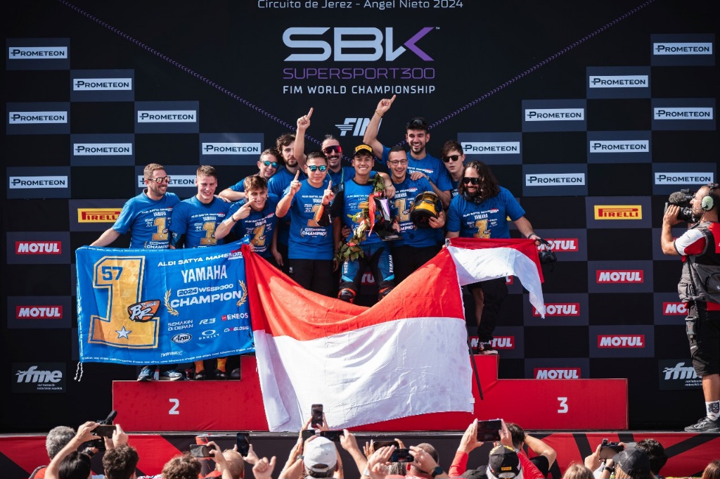Kaltimkita.com, JEREZ- Sejarah besar tercipta persembahan Yamaha Indonesia dan Aldi Satya Mahendra yang mengharumkan nama Indonesia di mata dunia. Catatan penting mewakili Tanah Air itu terukir saat Aldi Satya Mahendra “Garuda Muda Indonesia”, menyentuh garis finis seri pamungkas di World Supersport 300 (WorldSSP300) yang berlangsung di sirkuit Jerez Spanyol, Minggu 20 Oktober 2024. Pencapaian itu menandai keberhasilannya menorehkan sejarah sebagai rider Indonesia pertama yang menjadi juara dunia.