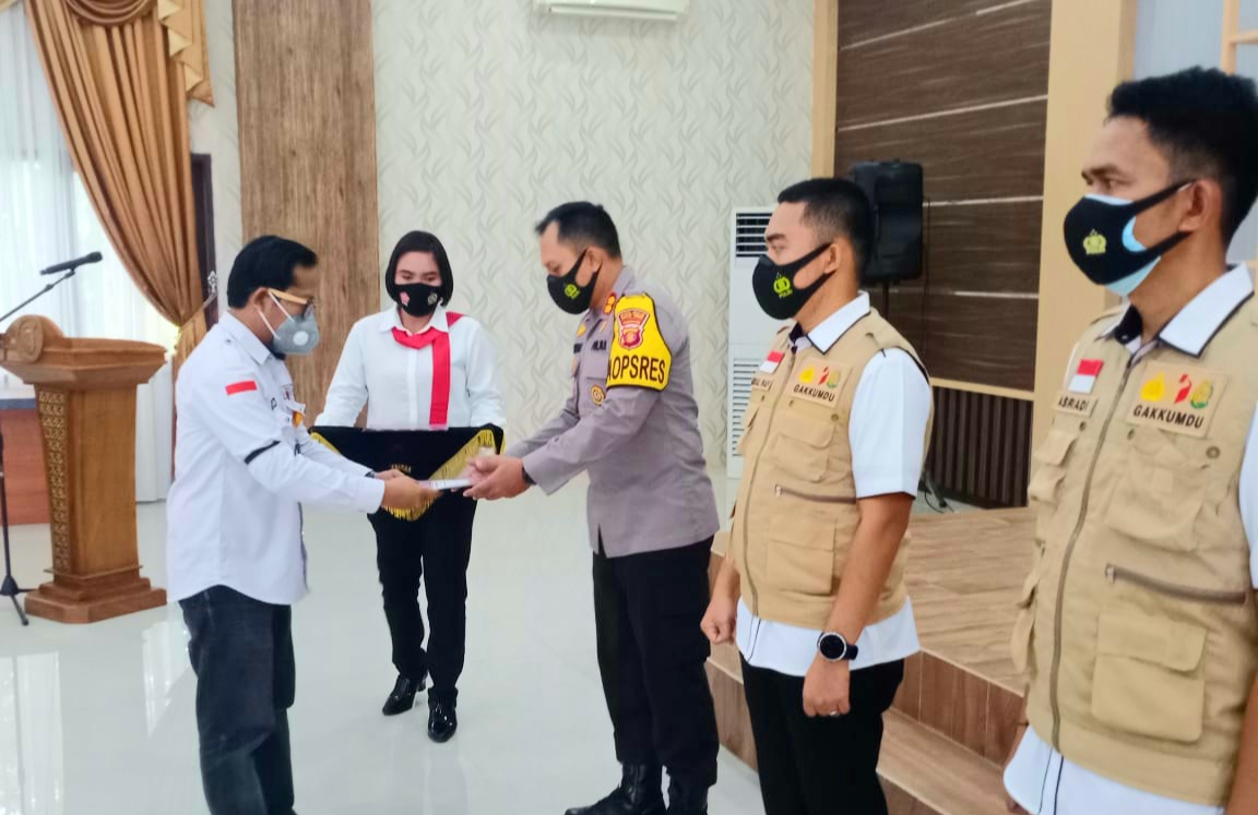 Salam komando protokol covid-19 saat ketua Bawaslu Andi Mappasilling bersama Kapolres Kutim AKBP Welly serah terima penghargaan piagam.