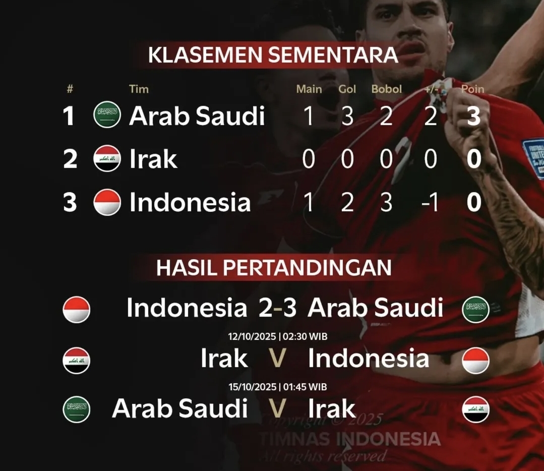 Ronde keempat Grup B Kualifikasi Piala Dunia 2026 zona Asia mempertemukan Indonesia vs Arab Saudi. Duel berlangsung di King Abdullah Sports City, Kamis (9/10/2025) dini hari WIB.