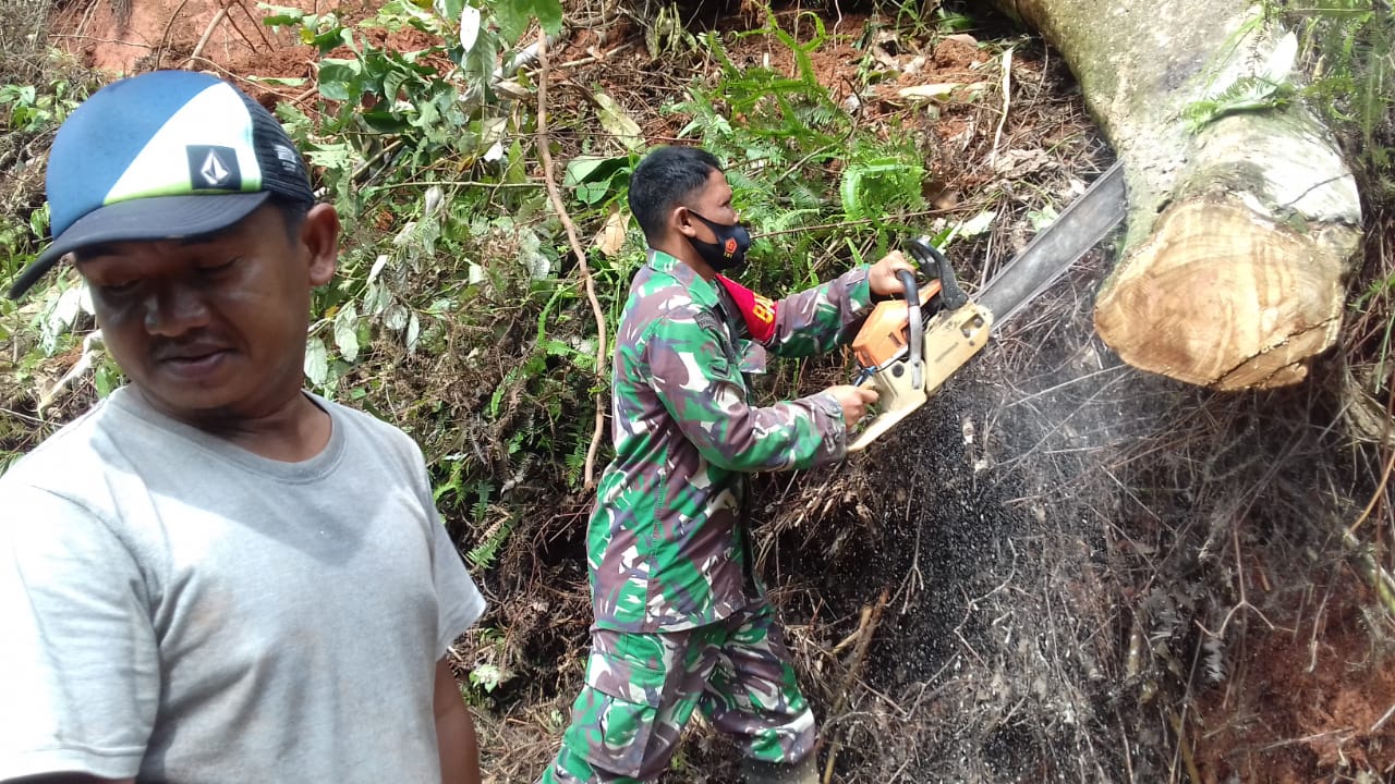 Babinsa Koramil 1002-07/Pagat Serda Sapto bersama warga masyarakat dan relawan dengan dibantu alat berat membuka jalan yang tertimbun longsor.Selasa (19/01).