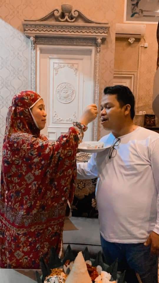 Potongan tumpeng itu dari tangan seorang ibu, yang telah berbakti membesarkan ketiga buah hati dan mendidiknya, selamat ultah ke-39 Tahun suamimu ini hanya mampu berkata cintamu nomor satu dan luar biasa