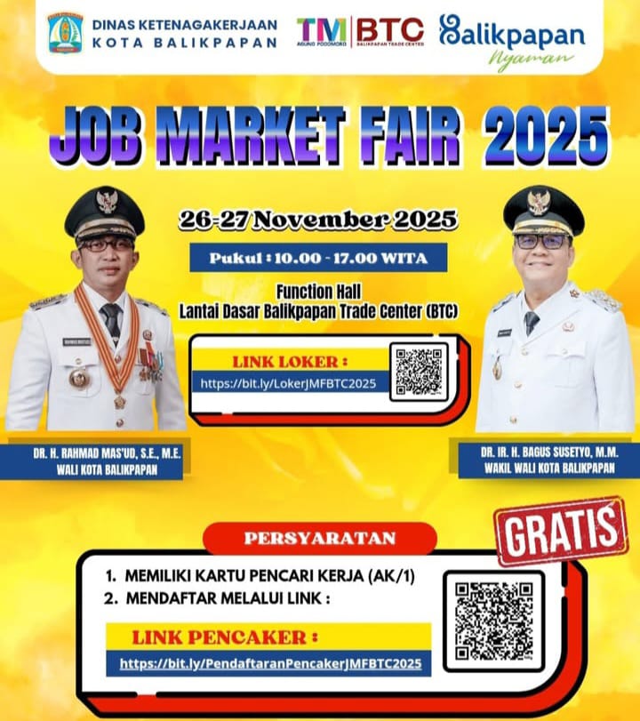 Kaltimkita.com, BALIKPAPAN — Pemerintah Kota Balikpapan kembali membuka akses luas bagi para pencari kerja melalui penyelenggaraan Job Market Fair (JMF) 2025. Pameran bursa kerja tahunan yang digelar Dinas Ketenagakerjaan (Disnaker) Kota Balikpapan ini akan berlangsung 26–27 November 2025 di Function Hall lantai dasar Balikpapan Trade Center (BTC), Jalan Jenderal Sudirman, tepat di samping Balikpapan Plaza.