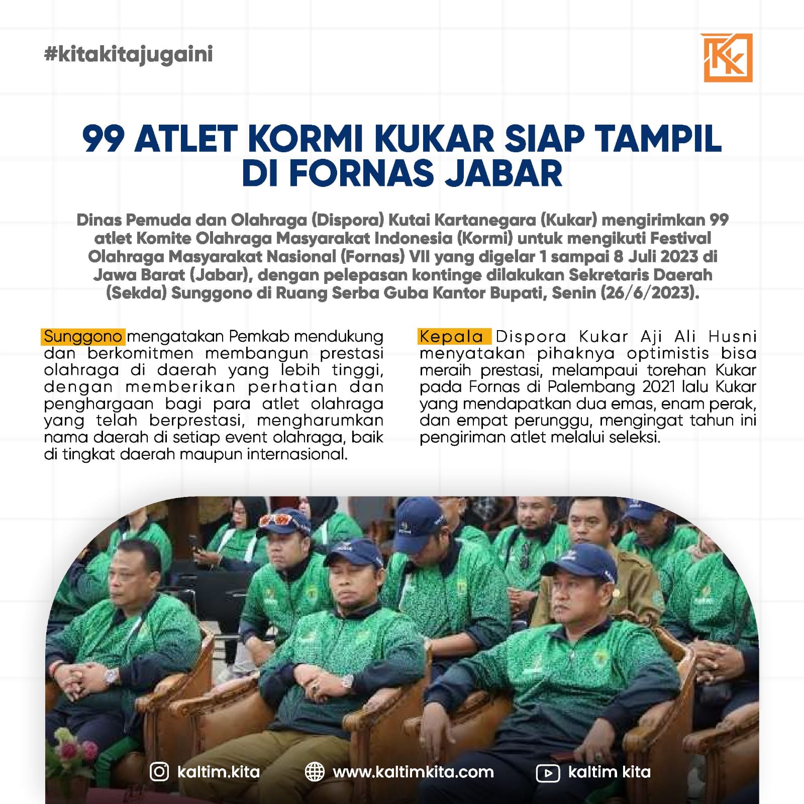 Kaltimkita.com, KUTAI KARTANEGARA – Dinas Pemuda dan Olahraga (Dispora) Kabupaten Kukar mengirimkan 99 atlet Komite Olahraga Masyarakat Indonesia (KORMI) untuk mengikuti Festival Olahraga Masyarakat Nasional (Fornas) VII dilaksanakan tanggal 1 – 8 Juli 2023 di Jawa Barat, pelepasan kontingen dilakukan oleh Sekda Kukar Sunggono, di Ruang Serba Guna Kantor Bupati, Senin (26/06/23).