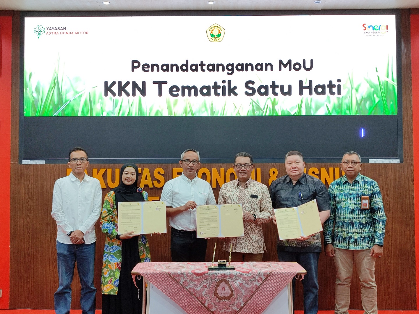 Menggandeng Universitas Jember (UNEJ) dan pemerintah Kabupaten Jember, KKN Tematik Satu Hati dibuka oleh Wakil Rektor Bidang Perencanaan, Kerja Sama, dan Informasi UNEJ - Prof. Drs. Bambang Kuswandi, M.Sc., Ph.D., Ketua Yayasan AHM Ahmad Muhibbuddin dan Bupati Jember yang diwakili oleh Asisten Administrasi Umum Pemkab Jember Harry Agustriono, ATD., MT. Komitmen untuk berkontribusi pada pembangunan daerah diperkuat melalui penandatanganan Nota Perjanjian Kerjasama Yayasan AHM dengan UNEJ dalam bidang penelitian, pengembangan dan pengabdian masyarakat di Gedung Fakultas Ekonomi dan Bisnis Universitas Jember (2/3).