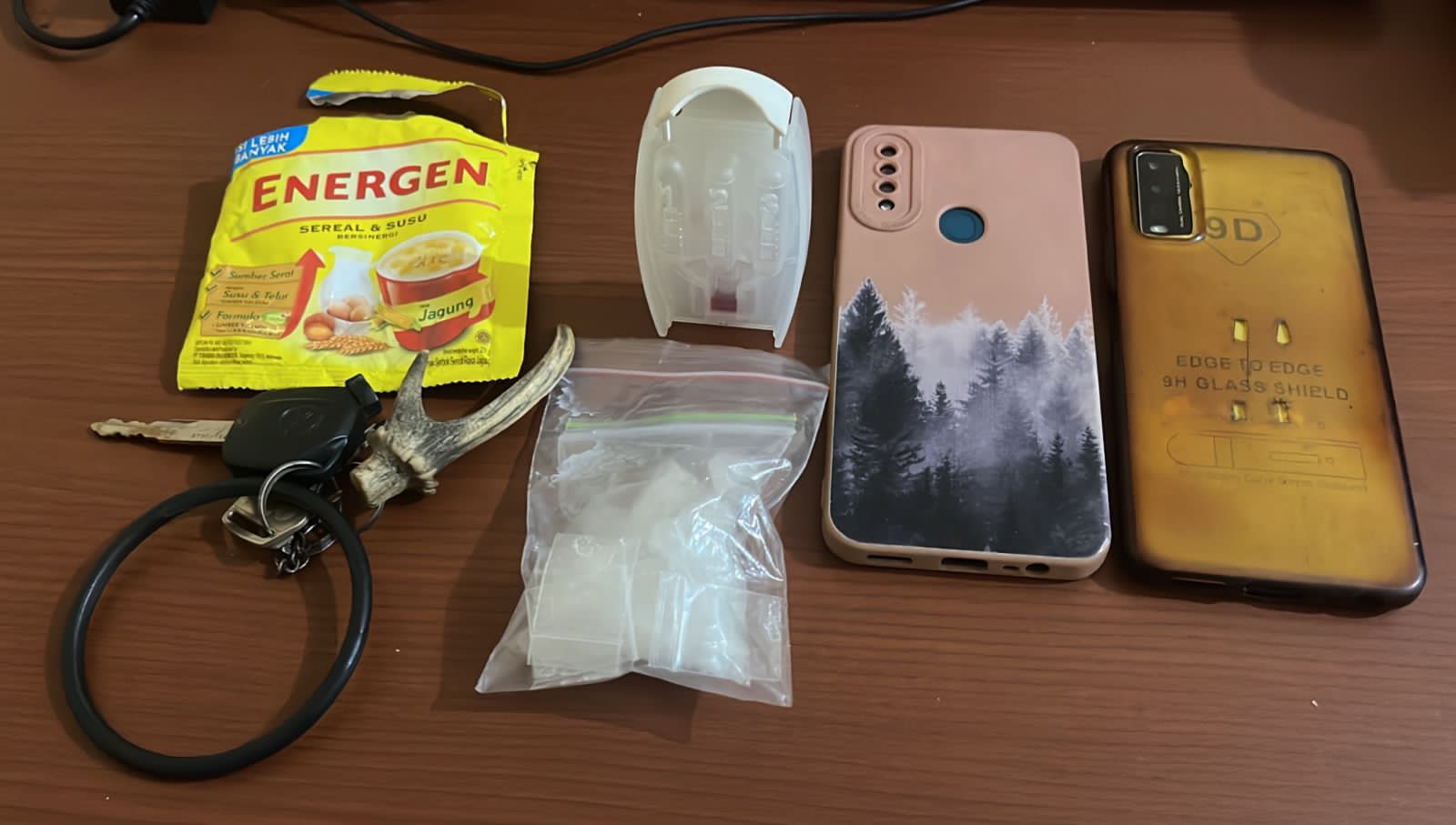 Saat penggeledahan, petugas menemukan lima klip plastik bening yang diduga berisi narkotika jenis sabu seberat 0,90 gram bruto, satu klip plastik bening yang diduga berisi narkotika jenis sabu seberat 48,8 gr bruto, 1 plastik energen, 1 buah handphone merek vivo warna hitam, 1 buah handphone merek oppo warna biru, 1 Buah motor Yamaha Soul GT.