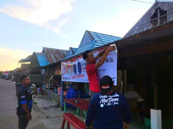 Ketua Garda NasDem Hariyanto kerahkan segenap pengurusnya dalam pergerakan pemasangan spanduk door to door di Kecamatan Muara Bengkal.