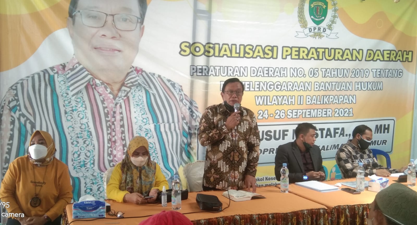 Hal itulah yang juga dilakukan anggota DPRD Kaltim Dapil Balikpapan, DR H Yusuf Mustafa SH MH. Politisi dari Partai Golkar ini menyosialisasikan Perda Nomor 5 Tahun 2019 tentang Penyelenggaraan Bantuan Hukum di RT 25 Sepinggan, Kecamatan Balikpapan Selatan, Minggu (26/9) siang.