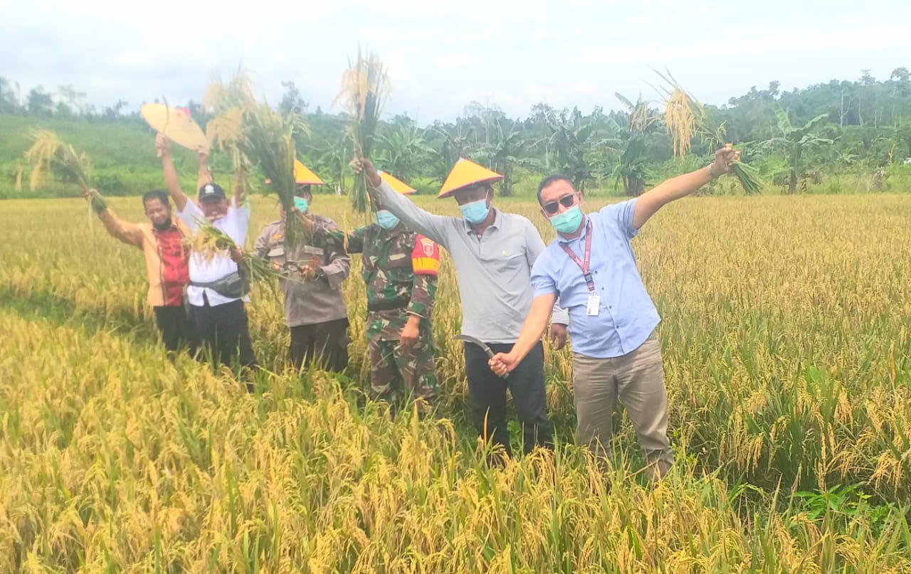 KEBERSAMAAN : Anggota DPRD Kutim Kidang, Wakil Ketua II DPRD Kutim Arfan, Kapolsek Bengalon Riyadi, Manager BCRD KPC Bengalon beserta jajaran, Babinsa Daud, PPL Dinas Pertanian Kutim berfoto bersama sebelum memanen padi.