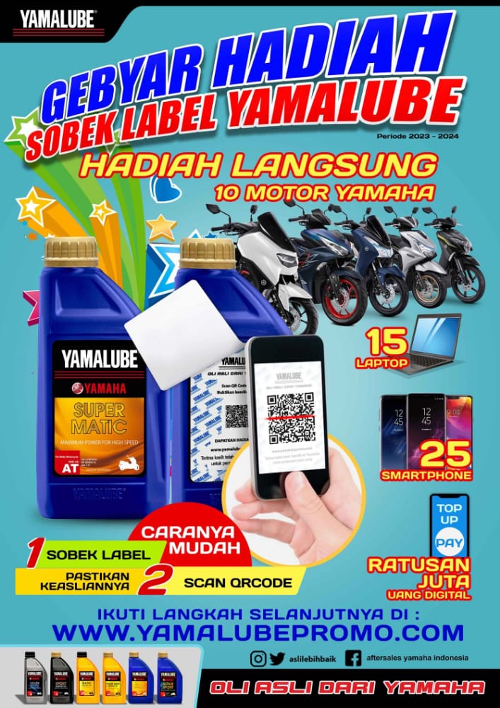 Bagi seluruh masyarakat Indonesia yang telah setia rutin melakukan servis berkala dengan menggunakan oli Yamalube ASLI berkesempatan mengikuti program Gebyar Hadiah Sobek Label Yamalube mulai dari tanggal 1 April 2023 hingga 31 Maret 2024. Seluruh konsumen Oli Yamalube ASLI yang beruntung berkesempatan membawa pulang hadiah langsung, diantaranya 10 unit sepeda motor terbaru dari Yamaha (All New NMAX 155 Connected, All New Aerox, Lexi, FreeGo 125, Gear 125 dan beberapa model lainnya), 15 laptop, 25 smartphone dan total ratusan juta uang digital.