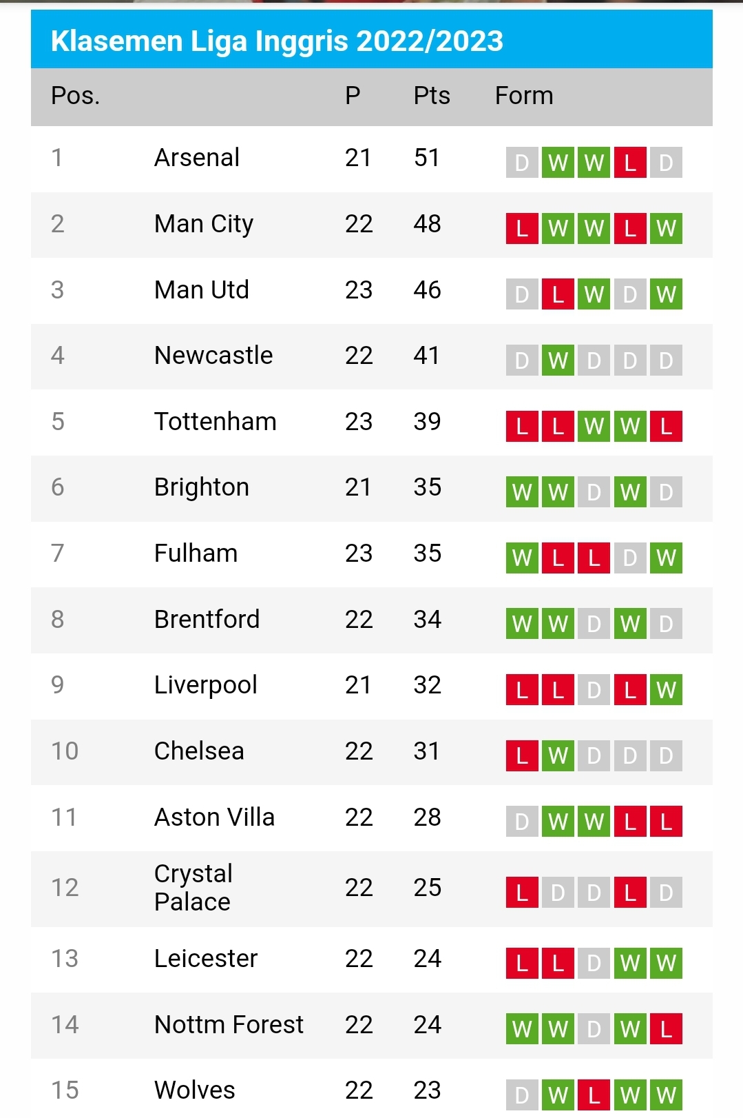 Liverpool sementara ada di peringkat kesembilan dengan 32 poin. Chelsea di bawahnya dengan 31 poin.