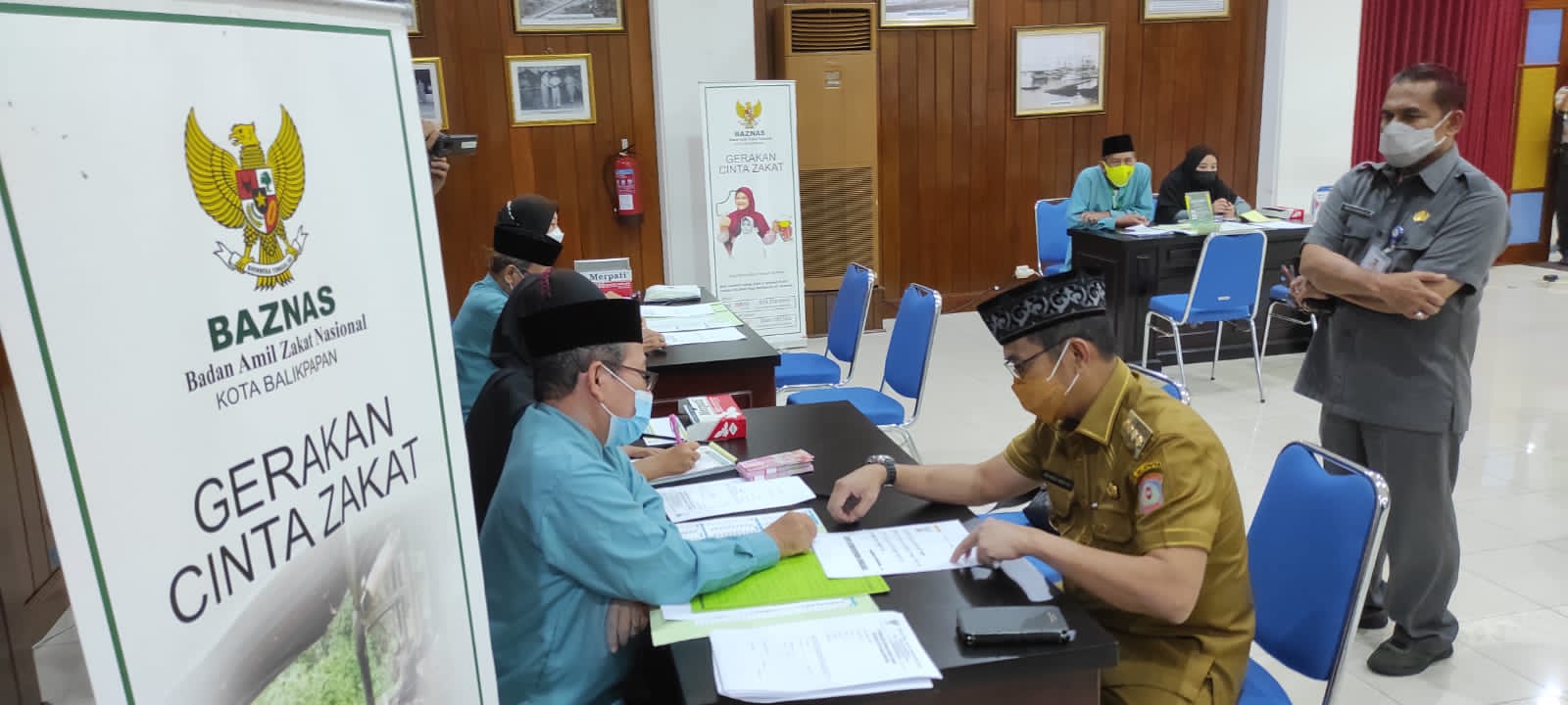 Kaltimkita.com, BALIKPAPAN - Menjelang Hari Raya Idul Fitri 1443 Hijriah, sejumlah Aparatur Sipil Negara (ASN) di lingkungan Pemerintah Kota (Pemkot) membayarkan zakat fitrah kepada Badan Amil Zakat Nasional (Baznas) Balikpapan, di Aula Balai Kota Pemkot, pada Senin (25/42022) pagi.