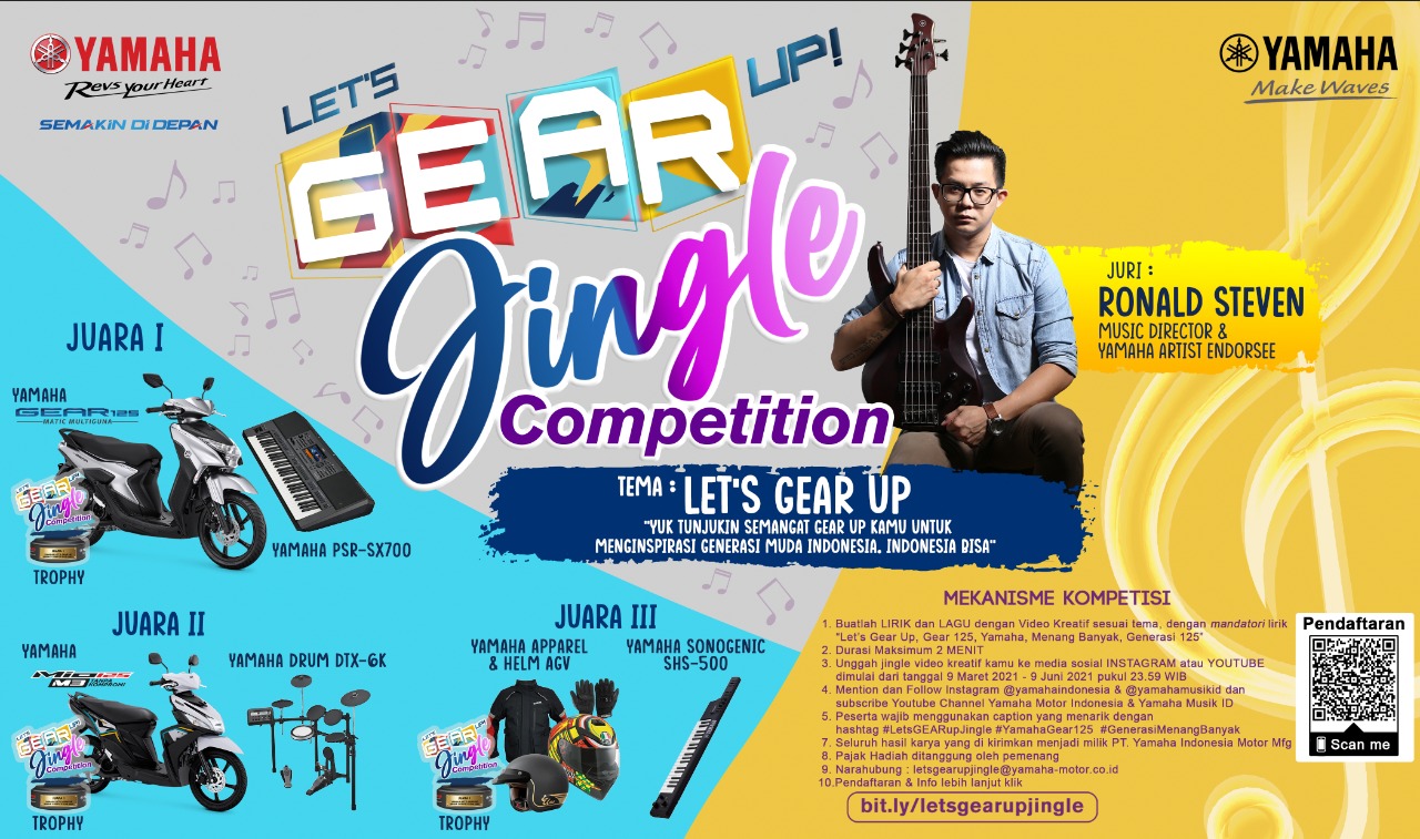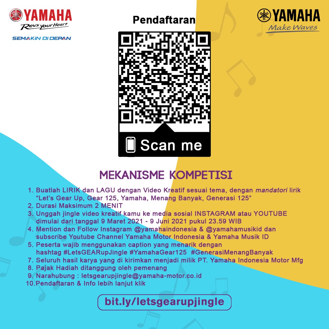 Ayo Generasi 125! GEAR UP karya terbaik kamu untuk menginpirasi Generasi Muda Indonesia. Kamu Bisa, Indonesia Bisa! Untuk pendaftaran dan informasi selengkapnya dapat langsung akses link bit.ly/letsgearupjingle atau email melalui letsgearupjingle@yamaha-motor.co.id. (*/bie)