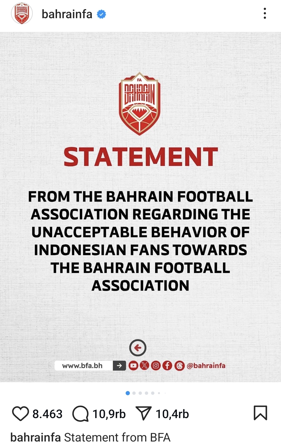 Asosiasi Sepakbola Bahrain telah memantau dalam beberapa hari terakhir, sikap yang tak bisa diterima dan tak bertanggung jawab dari fans Indonesia terhadap Asosiasi Sepakbola Bahrain dan para pemain tim nasional, menyusul pertandingan tim nasional kami melawan Indonesia di putaran ketiga kualifikasi Piala Dunia 2026 AFC.